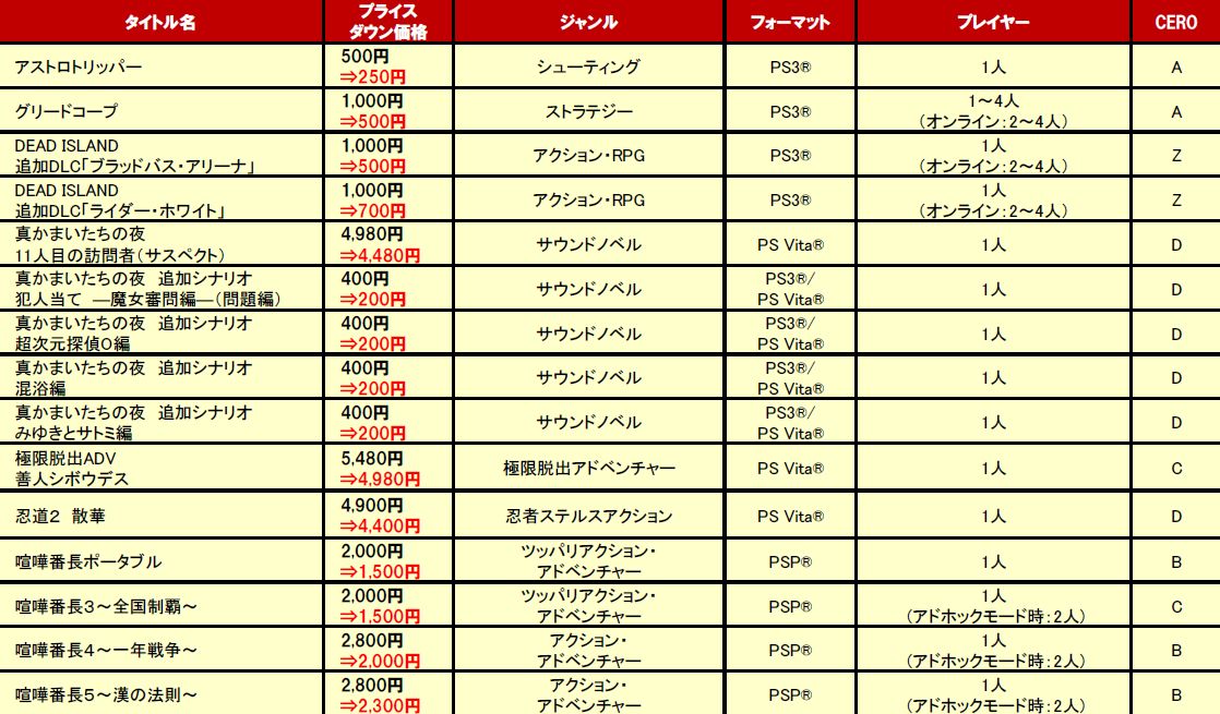 株式会社スパイク・チュンソフト(本社:東京都港区、代表取締役会長:中村光一、代表取締役社長:櫻井光俊)は、PlayStation Storeにて好評配信中のスパイク・チュンソフトタイトル(ダウンロード版/追加コンテンツ)を対象にした「スパイク・チュンソフトSPRINGSALE2012」を開催することを決定いたしました。キャンペーン対象となるタイトル/追加コンテンツは下記の通り。キャンペーン期間は2012年4月26日~2012年5月30日の期間限定。この機会をお見逃しなく、お得な価格でスパイク・チュンソフトタイトルをお楽しみください!