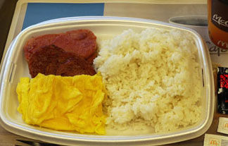 ハワイの朝マックはローカルメニューとして出されているものであり、アメリカ本土では食べることができない(らしい)。ご飯には玉子焼きとサラミ、スパム(ハンバーグ)などがついてくる。